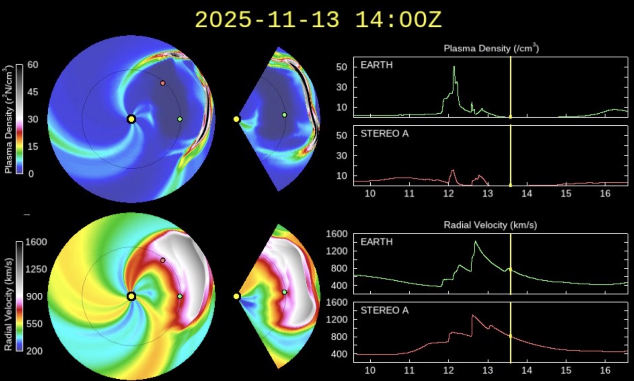 Non è però finita qui. Infatti, la terza eruzione associata al brillamento più intenso di ieri mattina è ancora in viaggio verso la Terra, e – sempre secondo il modello Enlil – potrebbe arrivare attorno alle nove ora italiana (20 Ut) di questa sera, mercoledì 12 novembre. Essendo la magnetosfera già in una condizione perturbata, questo ulteriore “colpo” potrebbe indurre la formazione di altre aurore, che sono già adesso in corso ma non sono visibili da noi per le basse latitudini e – ovviamente – perché è giorno. Non è da escludere quindi che la tempesta geomagnetica che è già in corso, ma ha già iniziato la fase di recupero che durerà tutto il resto della giornata, possa “riprendersi” questa sera generando altre aurore potenzialmente visibili anche dalle nostre parti, anche se per avere l’assoluta certezza ci vorrebbe la sfera di cristallo.