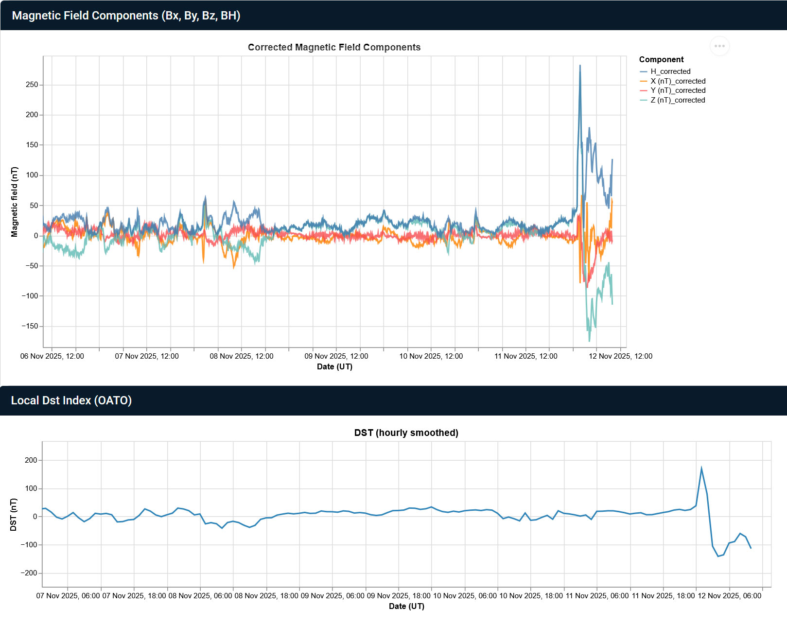 La tempesta geomagnetica ha quindi avuto inizio col tipico picco positivo dell’indice geomagnetico denominato “indice Dst”, seguito da un crollo a valori negativi fino a -238 nT alle ore 5 Ut di questa mattina, come rilevato dall’Osservatorio geomagnetico di Kyoto. La tempesta geomagnetica è stata prontamente rilevata anche dal magnetometro dell’Inaf in funzione presso l’Osservatorio astrofisico di Torino, installato nell’ambito del progetto Swelto, che rende disponibili ogni ora i dati acquisiti in tempo reale. Dati che mostrano un picco positivo alle ore 01 Ut, seguito poi da un crollo dell’indice Dst fino a -142 nT alle ore 04 Ut, e dalla fase di recupero attualmente in corso, come mostrato dalle figure qui sotto.