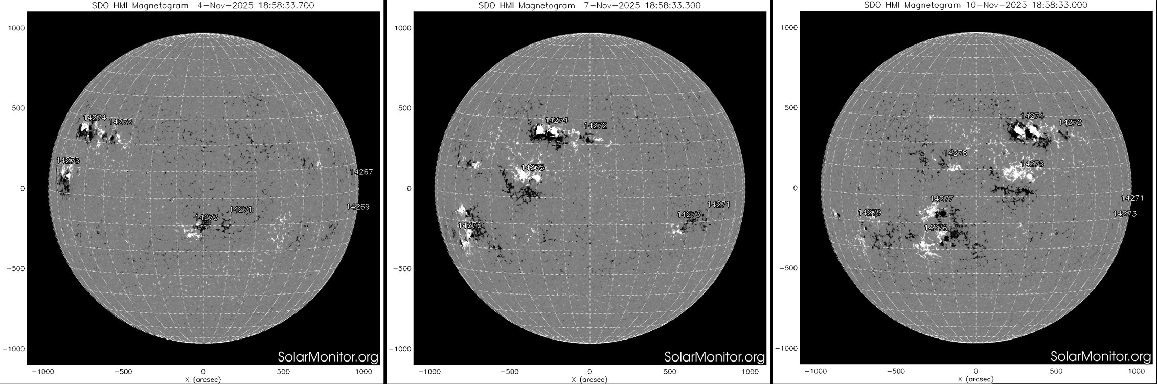 Sequenza di magnetogrammi acquisiti dallo strumento Hmi a bordo della sonda Sdo della Nasa. I magnetogrammi mostrano la distribuzione dei campi magnetici fotosferici nei giorni del 4 (sinistra), 7 (centro) e 10 (destra) novembre. Visibile nell’emisfero nord è la regione 4274 con la peculiare distribuzione dei campi magnetici descritta. Crediti: Nasa