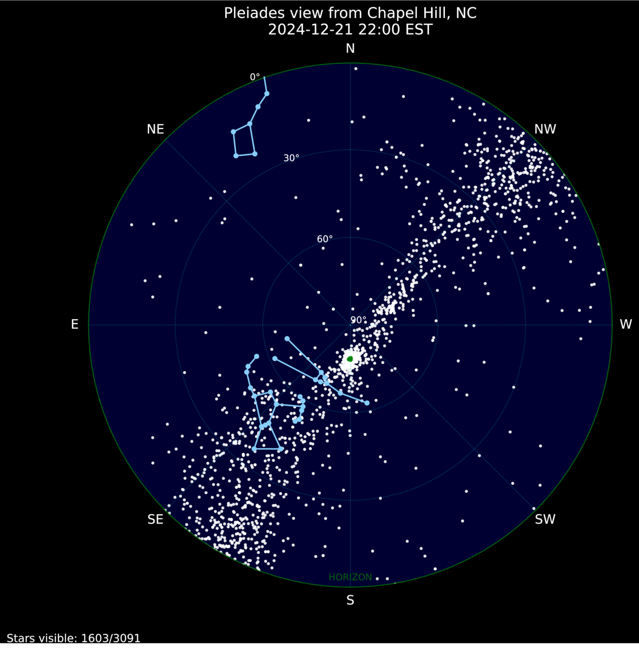 Questa mappa stellare mostra l’estensione completa del Greater Pleiades Complex così come apparirebbe nel cielo notturno di Pasadena se tutte le stelle che lo compongono fossero visibili. Delle 3019 stelle che compongono il complesso, 1631 sono visibili sopra l’orizzonte. Le sette stelle che compongono la costellazione delle Pleiadi, o Sette sorelle, sono al centro indicate in verde, mentre tutti gli altri membri del complesso sono in bianco. Il Grande Carro, Orione e il Toro sono sovrapposti in blu. Crediti: Andrew Boyle/Università della Carolina del Nord a Chapel Hill