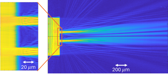 I risultati delle misurazioni, con un primo piano dell’area intorno alle due fessure a sinistra. Compare un chiaro pattern di interferenza. Crediti: Steenbergen et al.