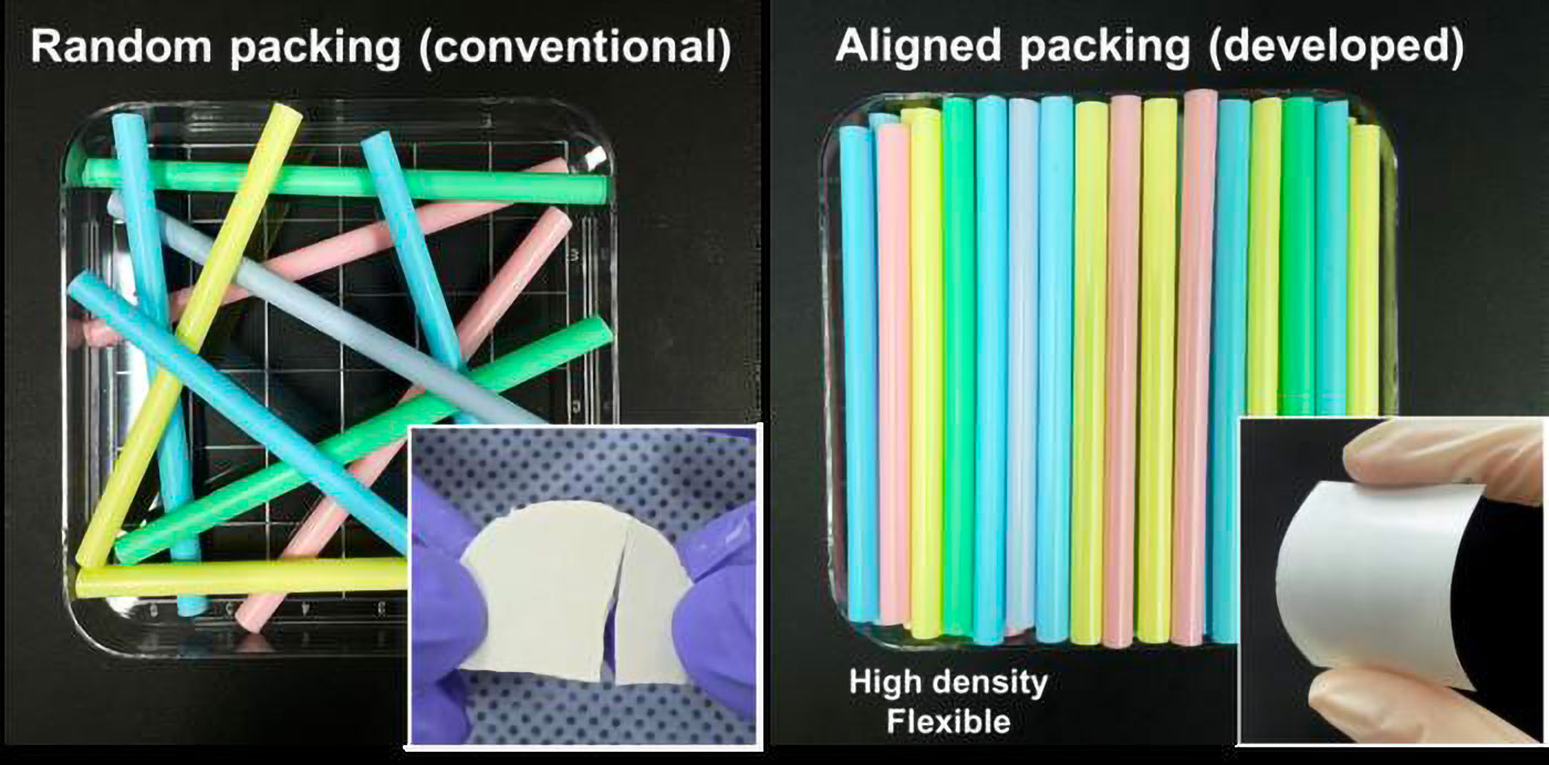 Nell’immagine a sinistra si vede la convenzionale pellicola Bnnt prodotta con nanotubi di nitruro di boro impacchettati casualmente, che la rendono fragile e predisposta alla rottura. Sulla destra la nuova pellicola a cristalli liquidi con i Bnnt allineati: oltre ad avere densità maggiore, è più flessibile e durevole. Crediti: Korea Institute of Science and Technology