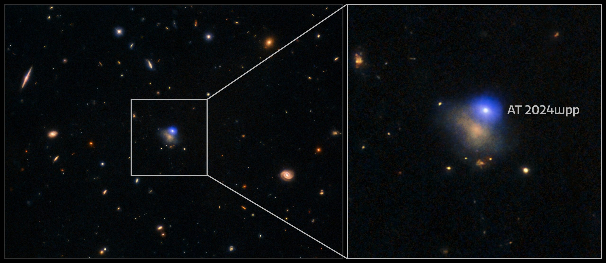 Questa immagine composita presenta dati relativi ai raggi X, agli ultravioletti, all’ottico e al vicino infrarosso di At 2024wpp. Il transiente è il punto luminoso situato nell’angolo superiore destro della sua galassia ospite, che dista 1,1 miliardi di anni luce dalla Terra. Crediti: International Gemini Observatory/NoirLab/Nsf/Aura, Image Processing: J. Miller (International Gemini Observatory/Nsf NoirLab), T.A. Rector (University of Alaska Anchorage/Nsf NoirLab), M. Zamani & D. de Martin (Nsf NoirLab)