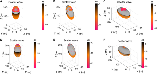 Distribuzione delle onde radio diffuse a 450 megahertz per tre diversi angoli di rotazione dell’asteroide (0, 30 e 90 gradi). I pannelli da A, B e C mostrano il caso di un asteroide con struttura interna uniforme, mentre i pannelli D, E ed F si riferiscono a un asteroide con struttura a doppio strato, caratterizzata da un nucleo più denso e da una superficie porosa. Il confronto tra i diversi angoli e le due configurazioni interne evidenzia come la struttura dell’asteroide influenzi in modo significativo il modo in cui le onde radio vengono diffuse, fornendo indizi sulla sua composizione interna. Crediti: Honghui Zhou et al., Space: Science & Technology, 2025