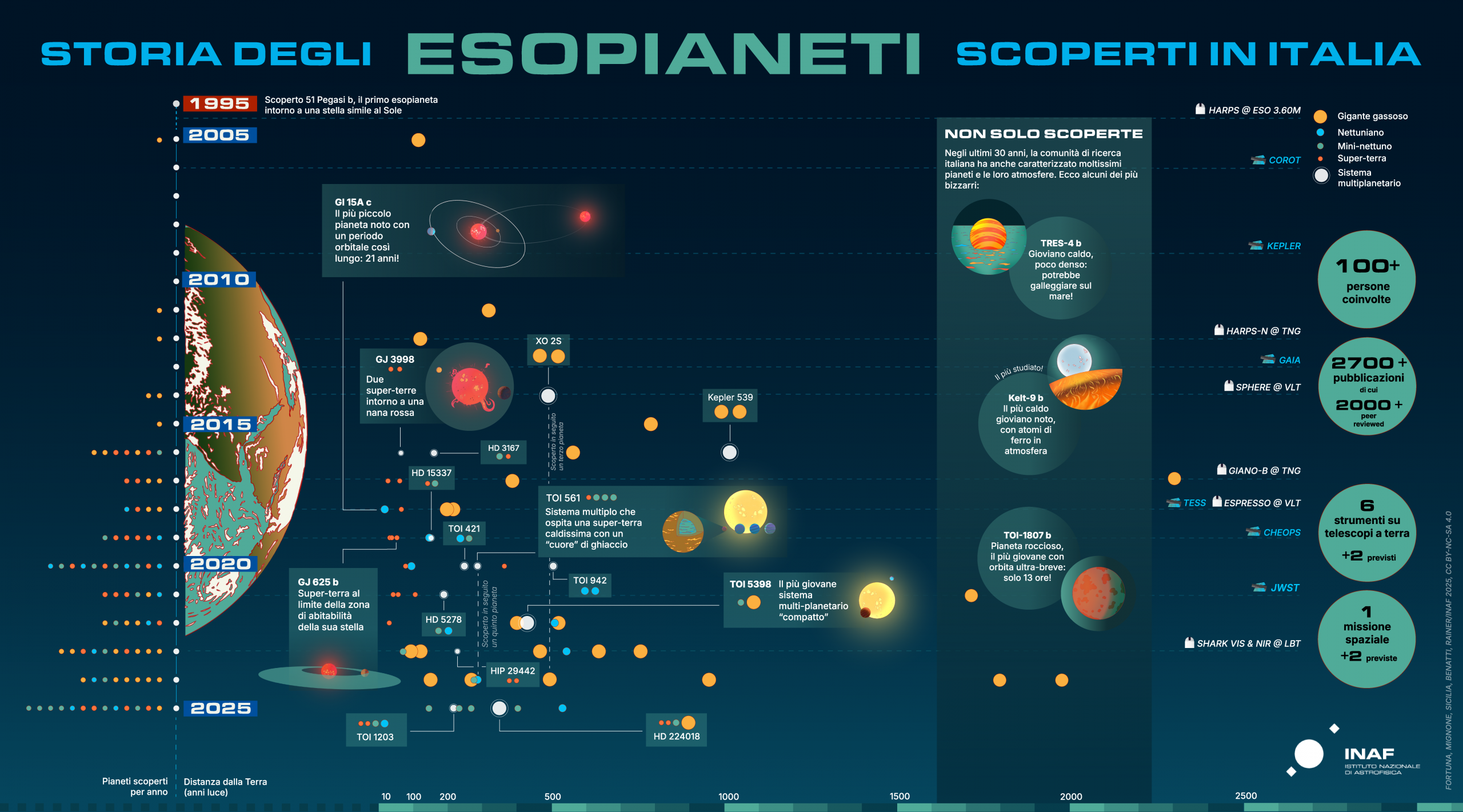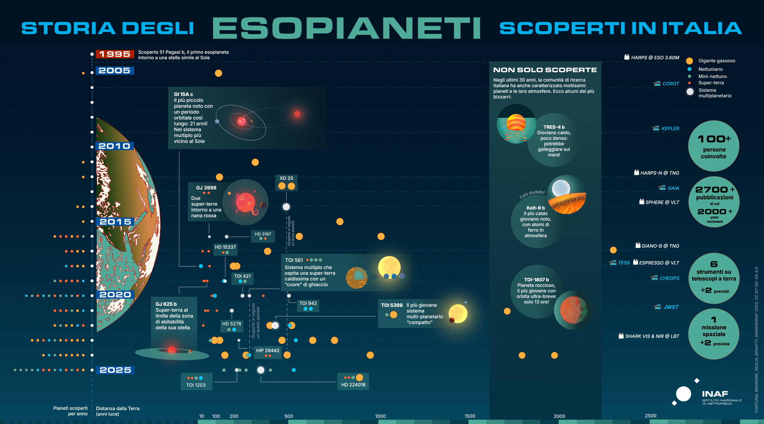 Infografica che racconta gli esopianeti scoperti in Italia. Sulla sinistra, i pianeti sono classificati per tipo; sulla destra, oltre al tipo (con un’indicazione approssimata delle dimensioni) è rappresentata anche la loro distanza dalla Terra, in anni luce. Sono inoltre evidenziati alcuni pianeti particolarmente interessanti – sia tra quelli scoperti che tra quelli caratterizzati in studi guidati da ricercatrici e ricercatori affiliati a istituti di ricerca e atenei italiani – sono raffigurati con delle illustrazioni artistiche (cliccare per ingrandire). Crediti: Fortuna, Mignone, Sicilia, Benatti, Rainer/Inaf 2025; Cc By-Nc-Sa 4.0