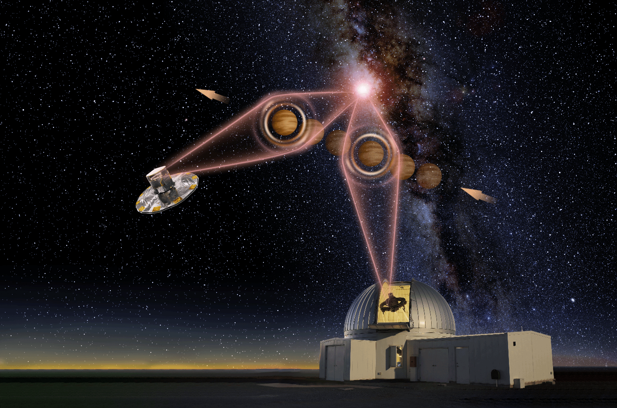 Osservatori da terra e dallo spazio hanno catturato un evento di microlensing prodotto dal passaggio di un corpo davanti a una stella. Attraverso queste osservazioni, i ricercatori hanno potuto avvalersi del metodo della parallasse per calcolare la massa e la distanza del corpo cosmico. Il metodo ha rivelato che il corpo è un pianeta di classe Saturno a circa diecimila anni luce dalla Terra, il primo pianeta errante del quale sia stato possibile misurare la massa. Credit: Yu Jingchuan