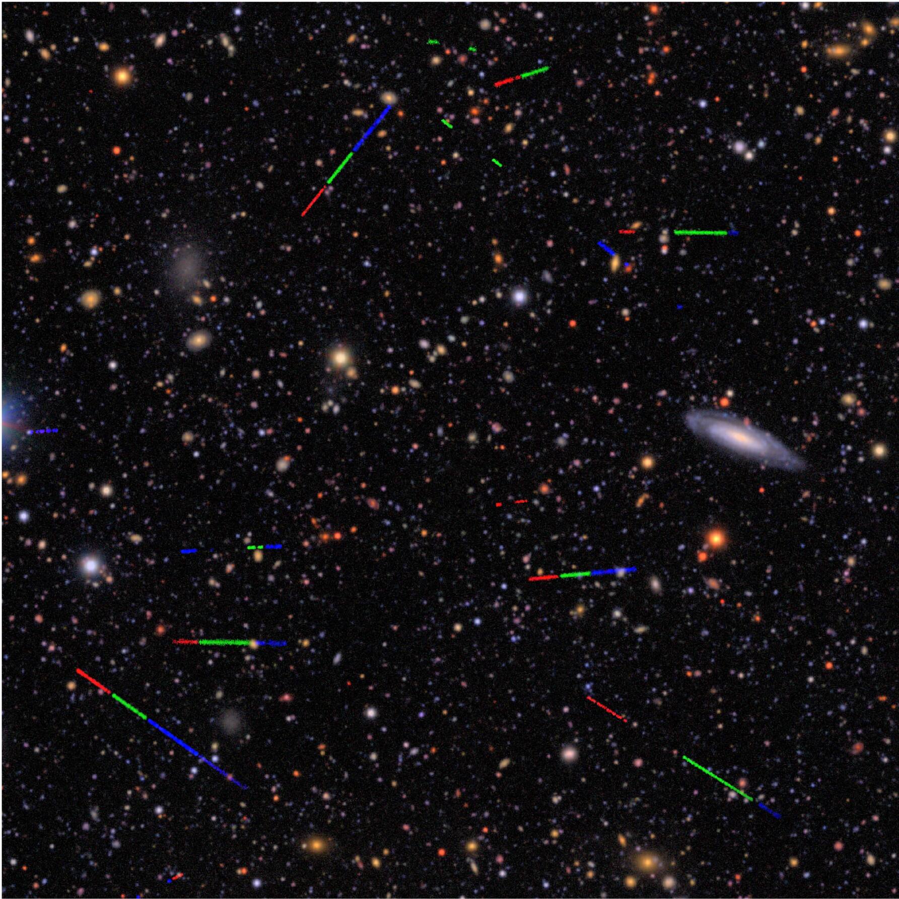 Una piccola regione di 6,5′ x 6,5′, situata appena a sinistra di M49, ripresa con il Rubin nel periodo aprile-maggio 2025. Le tracce sono dovute ad asteroidi luminosi che si sono spostati tra le singole esposizioni utilizzate per creare l’immagine. I diversi colori sono dovuti ai filtri utilizzati. Crediti: Sarah Greenstreet et al., 2026 ApJL 996 L33