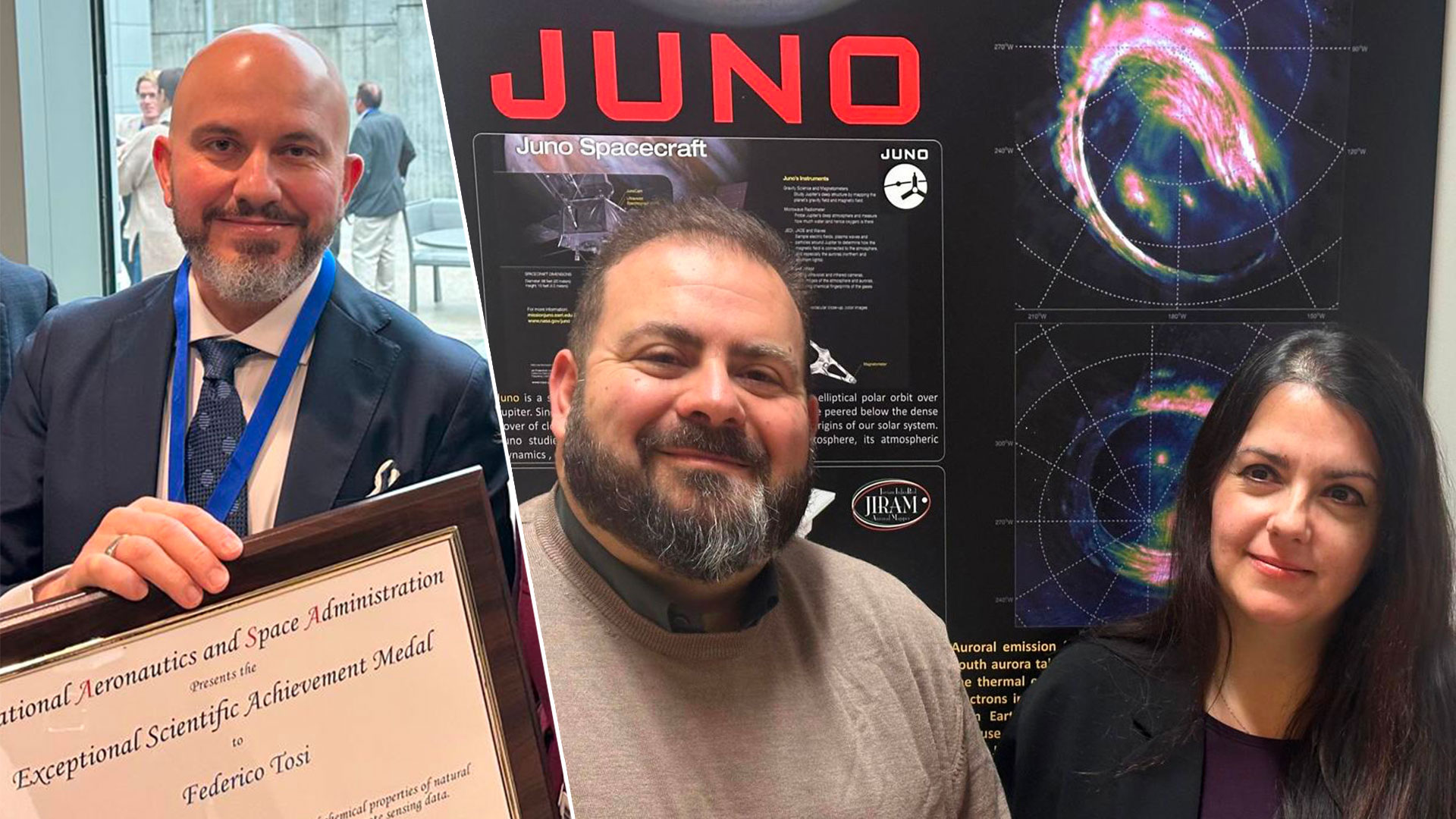 Anche Federico Tosi ha ricevuto la medaglia Esam per l’eccezionale contributo scientifico nell’ottenere le proprietà fisiche e chimiche di satelliti naturali e di piccoli corpi attraverso dati di remote sensing multi-spettrale. «È un riconoscimento che valorizza un percorso di ricerca dedicato a trasformare dati multisensore in informazioni solide su composizione e proprietà dei corpi del Sistema solare», sottolinea Tosi. «Desidero ringraziare in modo particolare tutto il team della missione Juno: la qualità degli strumenti, delle operazioni e del lavoro di analisi condiviso ha reso possibile raggiungere questi risultati. Lo considero un risultato di squadra e uno stimolo a proseguire, con la stessa cura, nell’esplorazione dei mondi gioviani e oltre».