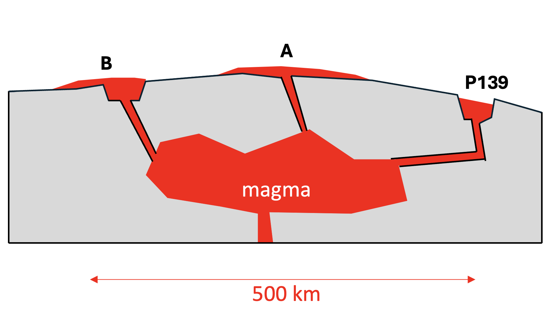 Rappresentazione della sezione trasversale di un sistema di camere magmatiche sotterranee. Un vasto serbatoio interconnesso (in rosso) alimenta le eruzioni superficiali in corrispondenza delle strutture A, B e P139. La scala orizzontale è di circa 500 chilometri, mentre quella verticale non è in scala. Crediti: Mura A., et al.