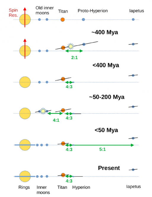 Illustrazione che mostra la sequenza di eventi che avrebbe portato alla formazione di Titano, di Iperione, delle lune interne e del sistema di anelli di Saturno. Le stelle a più punte rappresentano le collisioni, mentre le frecce verdi indicano le risonanze orbitali (cliccare per ingrandire). Crediti: Matija Ćuk et al., Planetary Science Journal, 2026