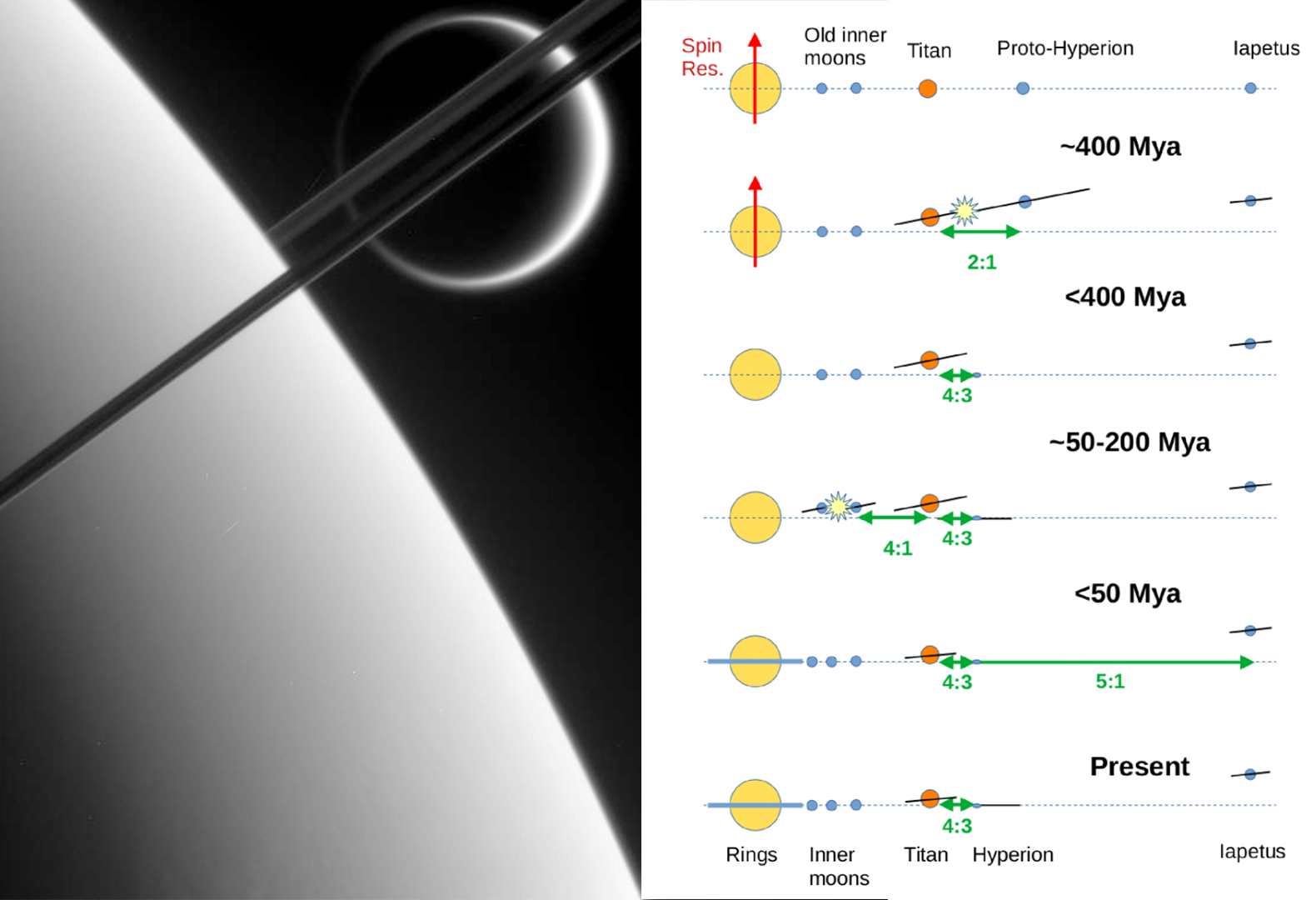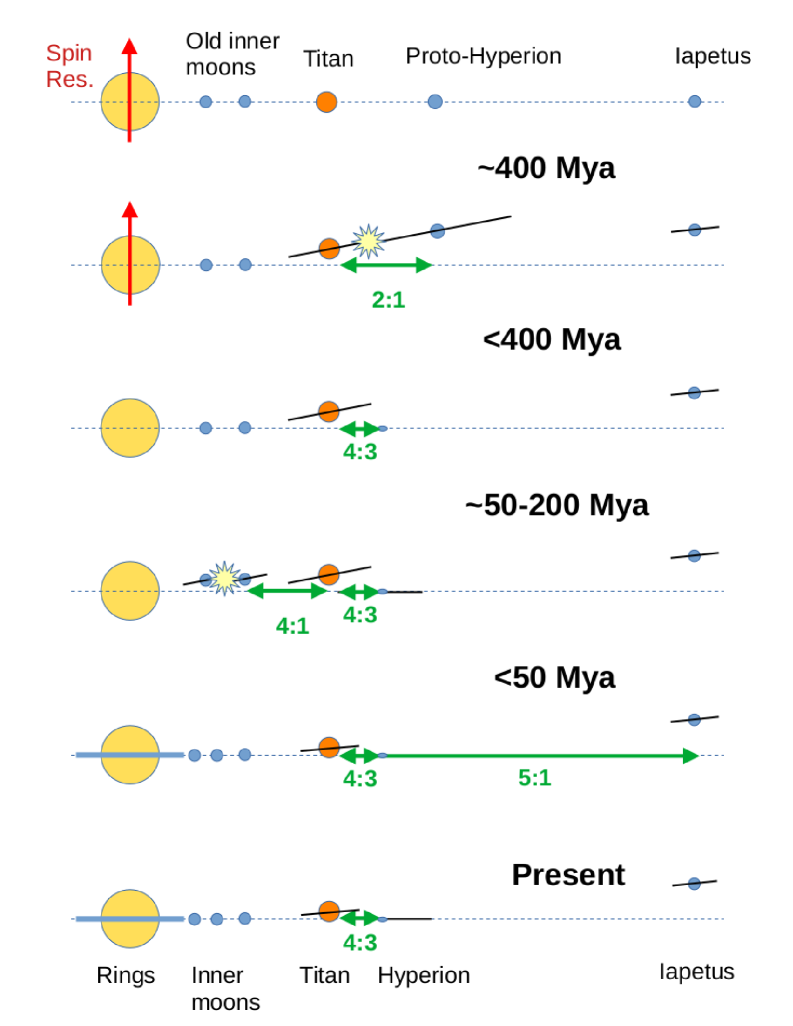 Illustrazione che mostra la sequenza di eventi che avrebbe portato alla formazione di Titano, di Iperione, delle lune interne e del sistema di anelli di Saturno. Le stelle a più punte rappresentano le collisioni, mentre le frecce verdi indicano le risonanze orbitali (cliccare per ingrandire). Crediti: Matija Ćuk et al., Planetary Science Journal, 2026