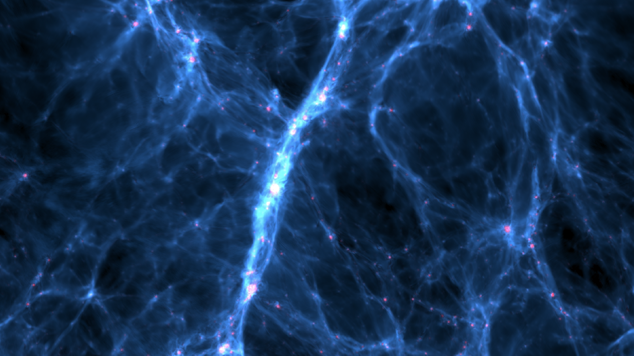 Rendering della distribuzione ipotetica del campo magnetico nella “ragnatela cosmica”, in una grande simulazione cosmologica. Crediti: Vazza F. et al. 2025 A&A