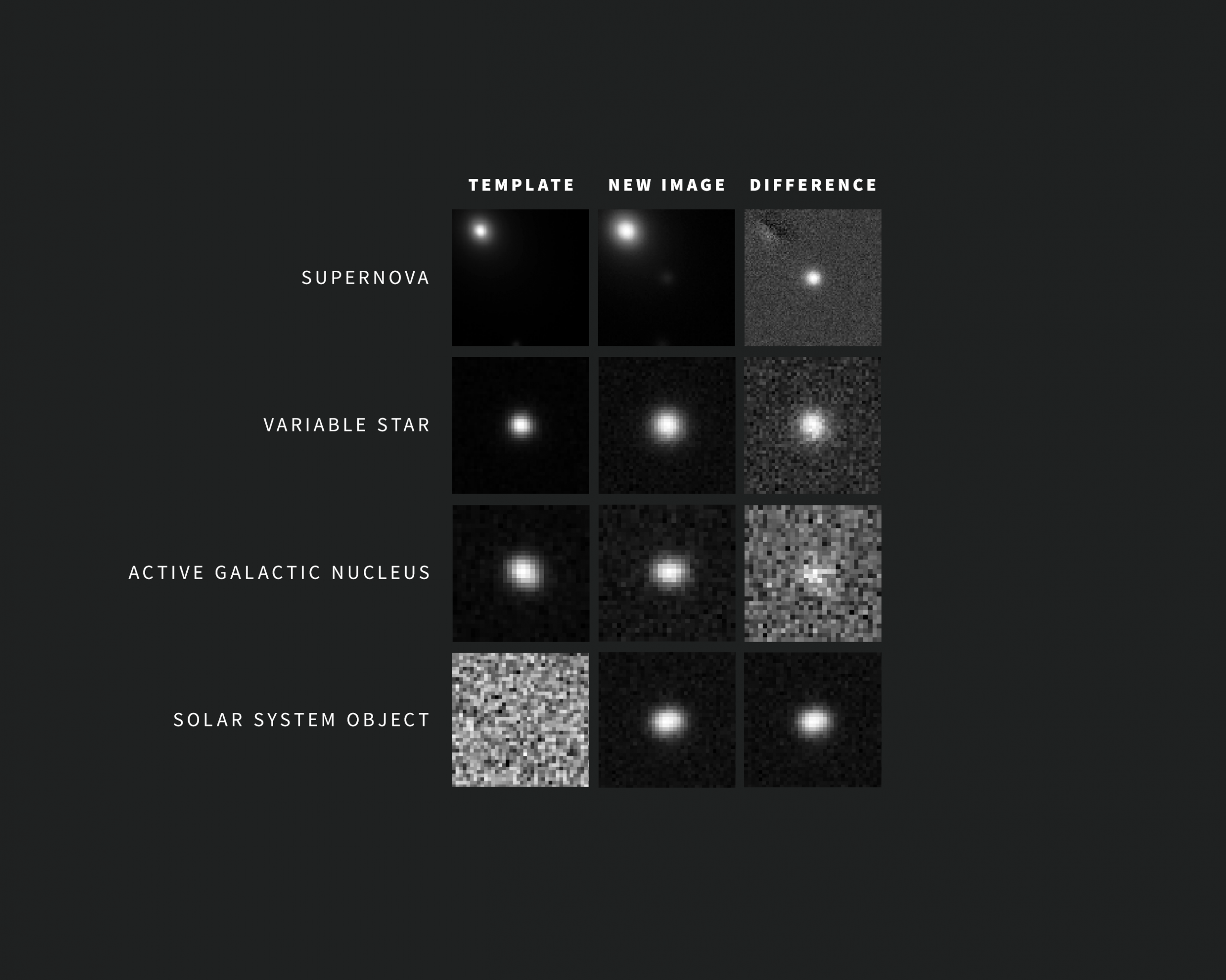 Il software del Vera C. Rubin Observatory confronta automaticamente le nuove immagini con un’immagine di riferimento (template), evidenziando solo le variazioni. Ogni cambiamento genera un alert entro pochi minuti, per oggetti come le supernove, le stelle variabili, i nuclei galattici attivi e gli oggetti del Sistema solare. Le immagini mostrate sono solo piccole porzioni di quelle raccolte dal telescopio, che illustrano il confronto tra il template, la nuova immagine e la differenza. Crediti: Nsf-Doe Vera C. Rubin Observatory/NoirLab/Slac/Aura. Classificazione degli alert fornita dai broker Alerce e Lasair