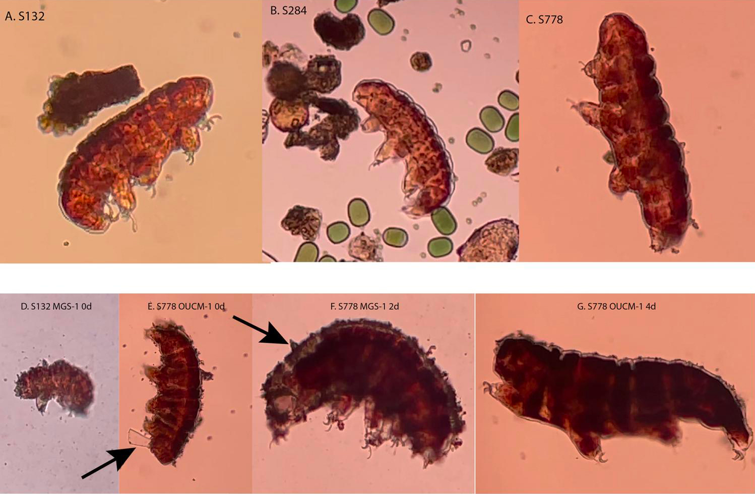 Le tre immagini in alto mostrano tardigradi attivi in un tipico ambiente terrestre di sabbia da spiaggia. Le quattro immagini in basso mostrano tardigradi attivi dopo un certo periodo di tempo nei terreni marziani simulati, con frecce che indicano alcune interazioni minerali. Crediti: Corien Bakermans/Penn State