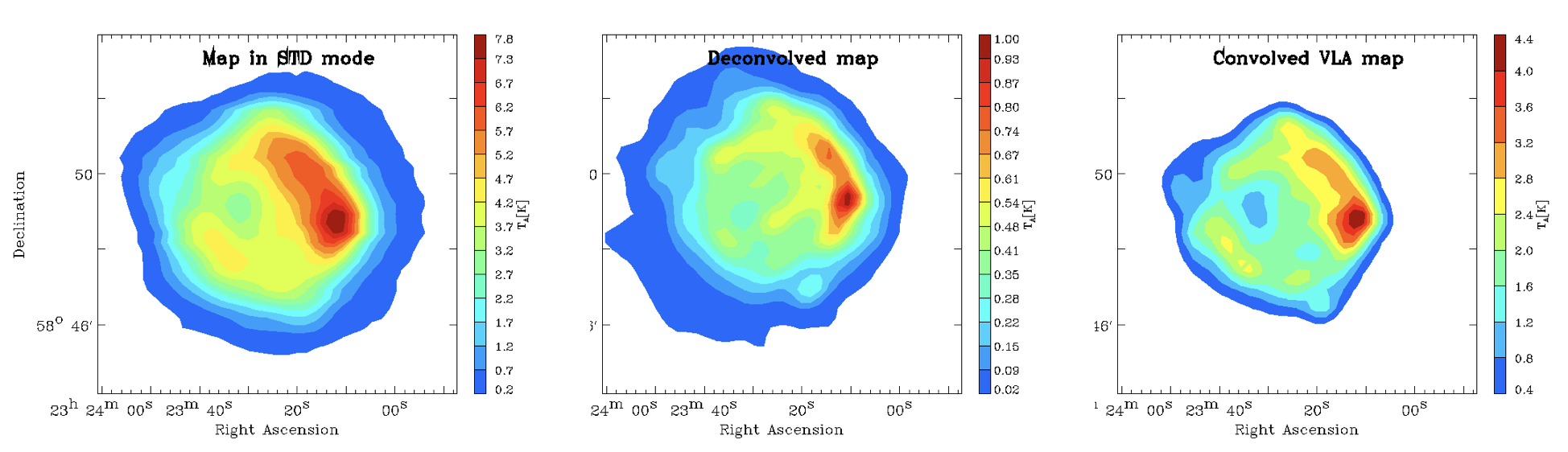 Mappe radio del resto di supernova Cassiopea A ottenute con il radiotelescopio Inaf Sardinia Radio Telescope ad una frequenza di 20 GHz. Il pannello a sinistra mostra l’immagine ottenuta con la modalità di osservazione standard, mentre il pannello centrale mostra l’immagine elaborata con la nuova modalità di osservazione a super-risoluzione. Per confronto, il pannello a destra mostra un’immagine d’archivio ottenuta con un interferometro radio (Very Large Array), a una risoluzione angolare paragonabile a quella della modalità a super-risoluzione di Srt. Sia la mappa dell’interferometro sia la nuova mappa di Srt mostrano dettagli della sorgente non visibili nell’immagine standard di Srt. Crediti: L. Olmi/Inaf