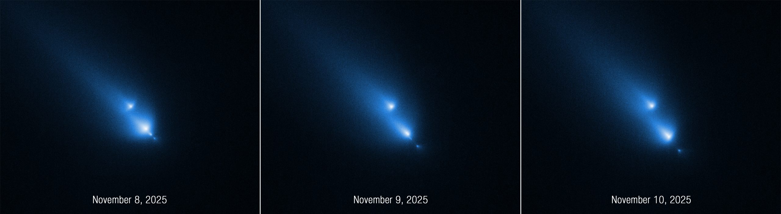 Una sequenza temporale composta da tre immagini affiancate. Da sinistra a destra, le immagini riportano le date 8 novembre 2025, 9 novembre 2025 e 10 novembre 2025. Questa serie di immagini del telescopio Hubble ritrae la cometa C/2025 K1 (Atlas), detta in breve K1, mentre si frammenta. La sequenza mostra la progressiva disintegrazione della cometa nel corso di questo breve periodo. Ogni pannello presenta diverse luci blu, sfocate e brillanti, che formano una linea diagonale dall’angolo in alto a sinistra a quello in basso a destra su uno sfondo nero. Nel primo pannello compaiono quattro oggetti simili a comete. Il più grande è il secondo partendo dall’angolo in alto a sinistra. Nel secondo pannello, l’oggetto più grande si è spezzato in due parti. Nel terzo pannello, i frammenti sembrano allontanarsi l’uno dall’altro lungo la linea diagonale invisibile. Crediti: Nasa, Esa, D. Bodewits (Auburn). Elaborazione delle immagini: J. DePasquale (Stsci)