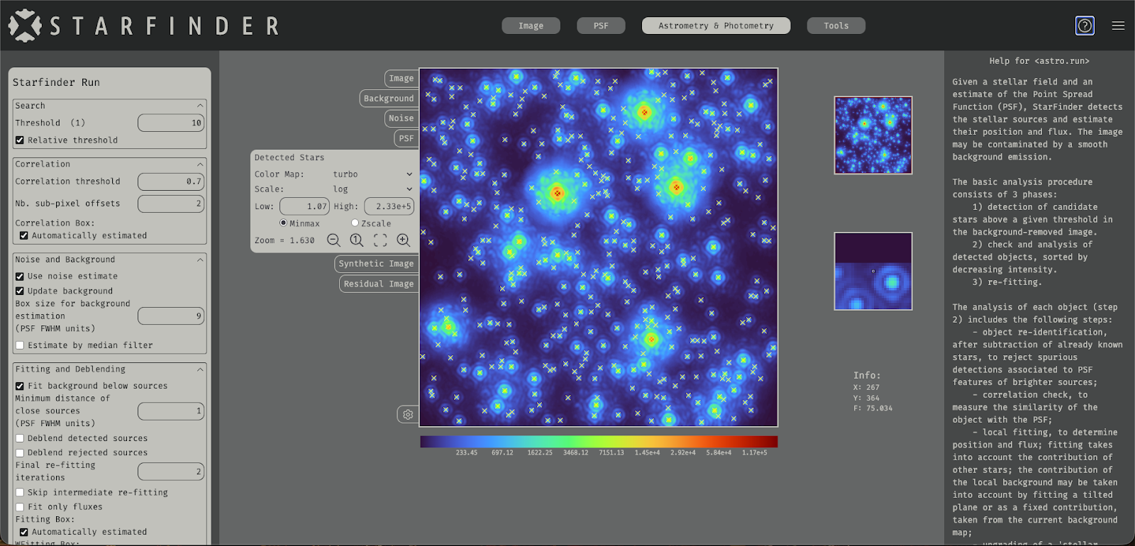 «Starfinder è un software sviluppato per l’analisi di immagini astronomiche di campi stellari, cioè zone di cielo dominate dalla presenza di sorgenti “puntiformi”, che appaiono come una copia della risposta strumentale: è la cosiddetta point spread function, che letteralmente significa ‘funzione di sparpagliamento di un punto’. La luce di una stella, infatti, si distribuisce sul piano dell’immagine di uno strumento in modo diverso a seconda della forma dell’apertura del telescopio (per effetto della diffrazione), della presenza o meno della turbolenza atmosferica e dell’eventuale utilizzo dell’ottica adattiva per correggerla».