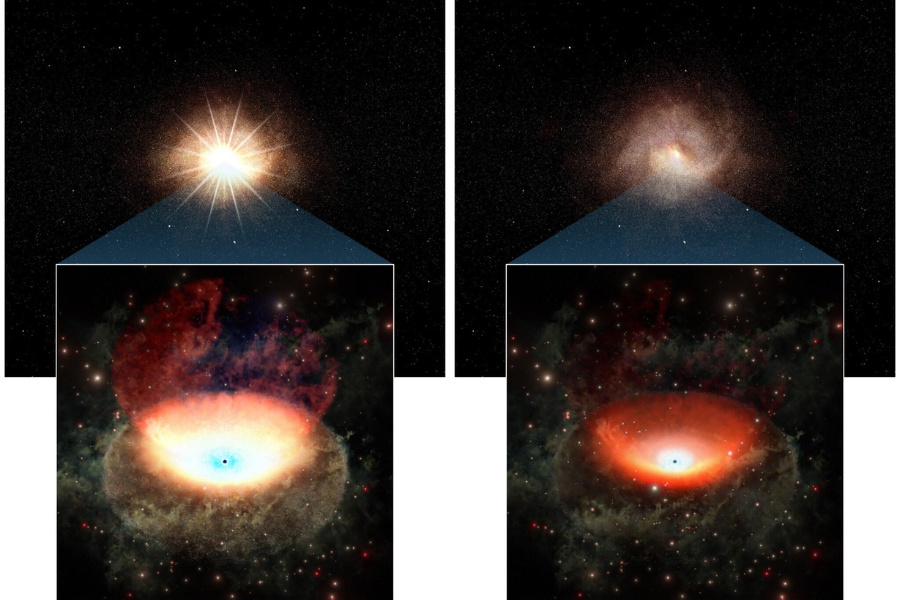 Rappresentazione artistica di un nucleo galattico attivo durante una fase luminosa (a sinistra) e una fase debole (a destra). I pannelli superiori mostrano l’intera galassia, mentre quelli inferiori sono un ingrandimento della regione centrale. Nella fase luminosa, il disco di accrescimento attorno al buco nero supermassiccio (la regione scura al centro) e uno spesso anello di gas e polveri a forma di ciambella brillano intensamente. Quando il flusso di gas verso il buco nero diminuisce, la regione centrale diventa molto più debole. Crediti: Chiba Institute of Technology