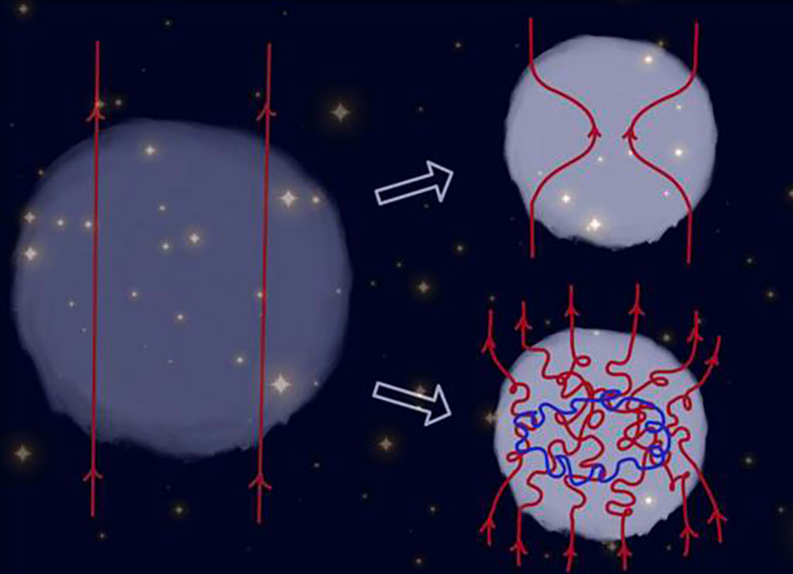A sinistra, rappresentazione schematica di una nube di plasma in collasso con un campo magnetico uniforme (linee in rosso). In alto a destra: la sola compressione amplifica il campo. In basso a destra: la turbolenza indotta dal collasso accelera l’amplificazione dell’effetto dinamo (introducendo anche una componente orizzontale, in blu), producendo campi magnetici più intensi rispetto a quelli generati dalla sola compressione. Crediti: Pallavi Bhat, Anvar Shukurov, Muhammed Irshad e Kandaswamy Subramanian