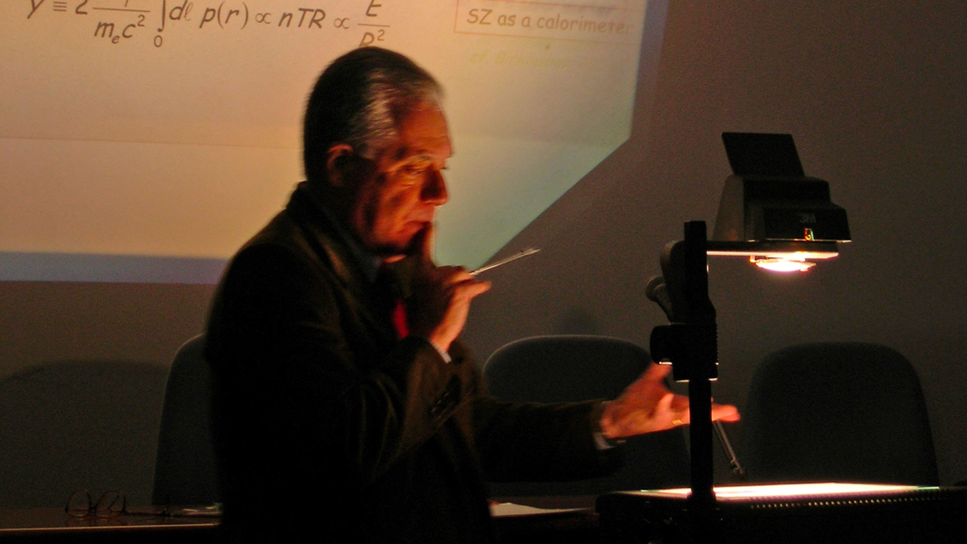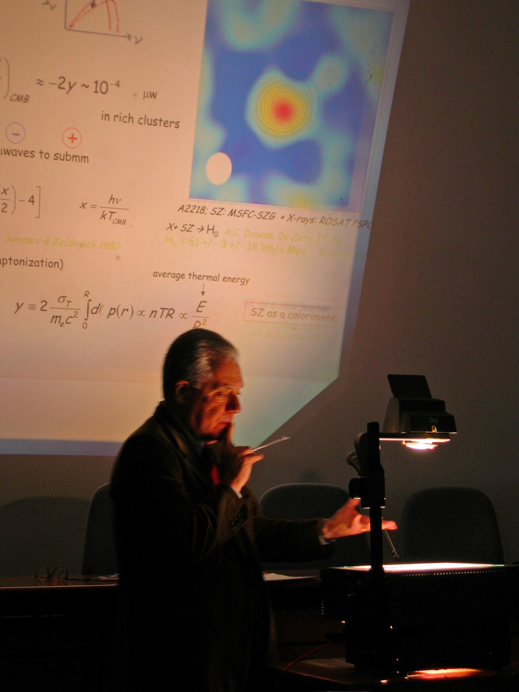 Alfonso Cavaliere durante il workshop in suo onore del 2003 intento a illustrare uno dei suoi celebri lucidi. Crediti: A. Fontana
