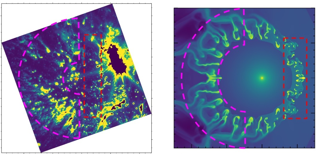 Nell’immagine a destra vediamo la regione intorno al sistema Wd1-72, osservata con Miri a 10 micron. La posizione di Wd1-72 è indicata da una stella. Si possono notare piccoli frammenti di gas e polvere che sembrano “correre” verso Wd1-72. La maggior parte di questi frammenti ha una forma allungata, mentre quelli sul lato destro dell’immagine puntano invece verso il centro dell’ammasso stellare. A sinistra c’è una rappresentazione del modello evolutivo, che mostra come i frammenti espulsi da Wd1-72 si muovono e cambiano forma nel tempo. Le aree evidenziate con linee tratteggiate servono a confrontare direttamente il modello con ciò che osserviamo nello spazio, aiutandoci a capire meglio la dinamica di questo sistema stellare. Crediti: Jwst/Miri, Larkin et al., A&A, 2026