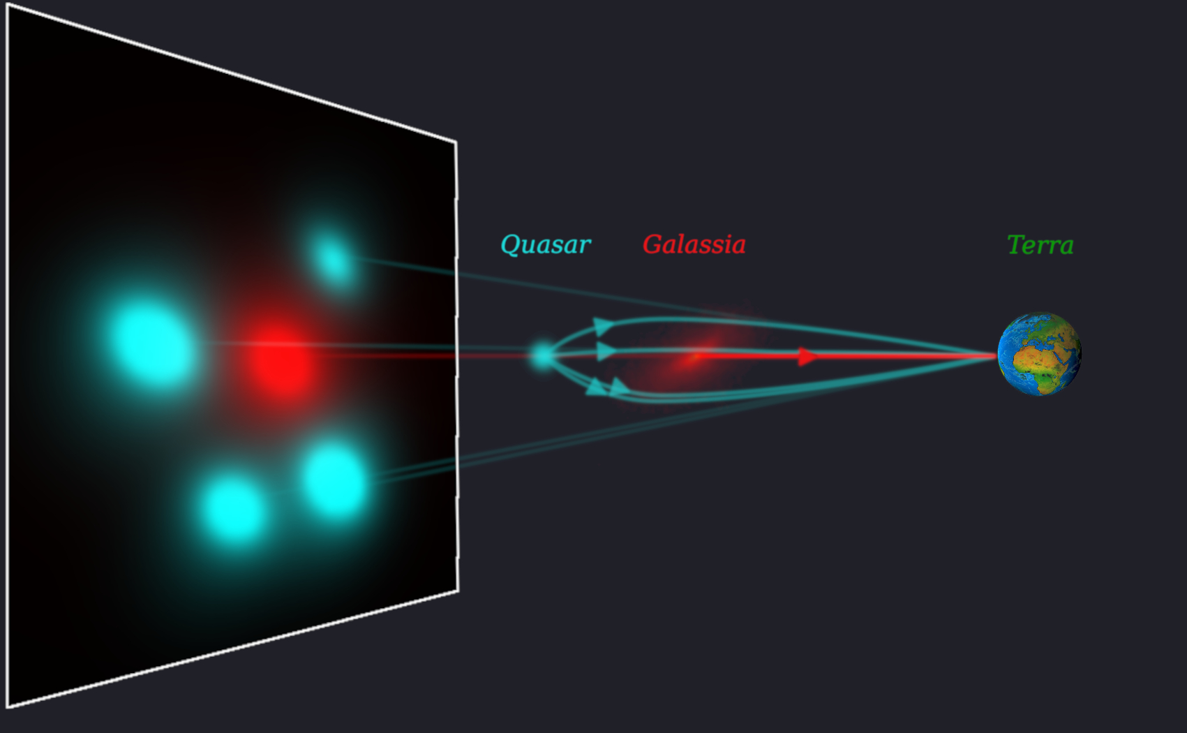 Questo schema mostra come si forma una croce di Einstein, usando come modello proprio J1453g. La luce emessa da un quasar distante (in ciano) viene deviata dal campo gravitazionale di una galassia (in rosso), che si trova tra il quasar e la Terra. A causa di questa deflessione, i raggi luminosi convergono verso la Terra, producendo immagini multiple dello stesso quasar. Quando l’allineamento tra sorgente, lente e osservatore è particolarmente preciso, queste immagini appaiono disposte in una configurazione a croce attorno alla galassia centrale. Crediti: Quirino D’Amato