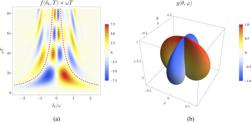 Funzioni f(δk,T) e g(θ,φ) che determinano la dipendenza dalla frequenza e dall’angolo della correzione Gw all’emissione di fotoni. I loro valori sono indicati a colori, dove il blu e il rosso corrispondono rispettivamente a valori negativi e positivi. Da (a) si nota che la Gw dà origine a correzioni antisimmetriche positive e negative ai lati della frequenza portante. La funzione g(θ,φ) nel pannello (b), mostra che l’effetto è massimo lungo la direzione positiva di (direzione di propagazione delle onde gravitazionali) e svanisce nella direzione opposta. Esso presenta un andamento quadrupolare nel piano con segni opposti lungo gli assi. Fonte: Jerzy Paczos et al., Prl, 2026