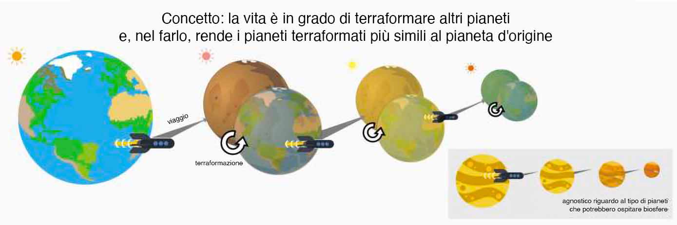 Infografica che mostra il concetto alla base del nuovo metodo di ricerca della vita extraterrestre proposto dagli astrobiologi Harrison Smith e Lana Sinapayen. Secondo tale approccio, la vita potrebbe diffondersi tra i pianeti di sistemi stellari diversi, modificandoli nel tempo e rendendoli progressivamente più simili tra loro e al mondo d’origine. In questo scenario, ogni passaggio di “terraformazione biologica” lascia una traccia, creando gruppi di pianeti con caratteristiche osservabili simili. Crediti: Harrison B. Smith