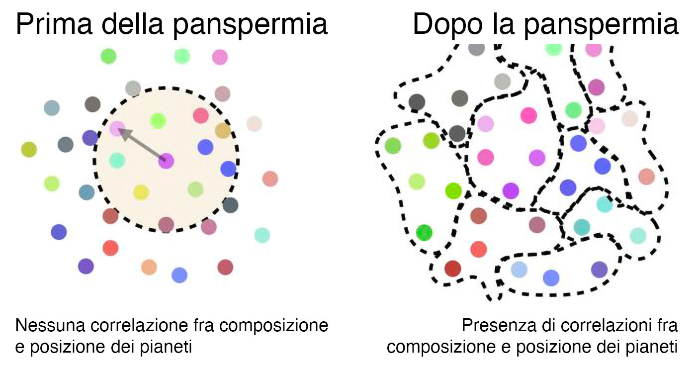 Se la vita è in grado di viaggiare tra pianeti e di terraformarli, i ricercatori si aspettano l’emergere di correlazioni tra la posizione dei pianeti e le loro caratteristiche osservabili, come la composizione atmosferica. In questa illustrazione, a sinistra i pianeti (cerchietti colorati) non mostrano alcuna relazione tra posizione e proprietà. A destra, invece, sono indicati gruppi di pianeti che mostrano correlazioni, rappresentati da cerchietti di colori simili circondati da linee tratteggiate. Crediti: Harrison Smith