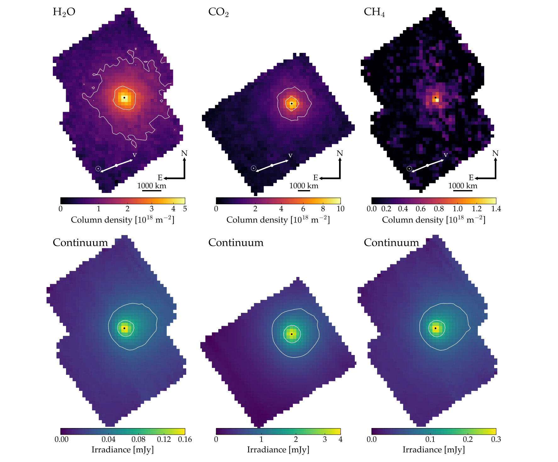 Mappe che mostrano le emissioni di acqua, anidride carbonica e metano da parte di 3I/Atlas, mentre la cometa interstellare compiva la sua orbita attorno al Sole e attraversava il Sistema solare. Crediti: Matthew Belyakov et al., 2026 ApJL 1001 L11