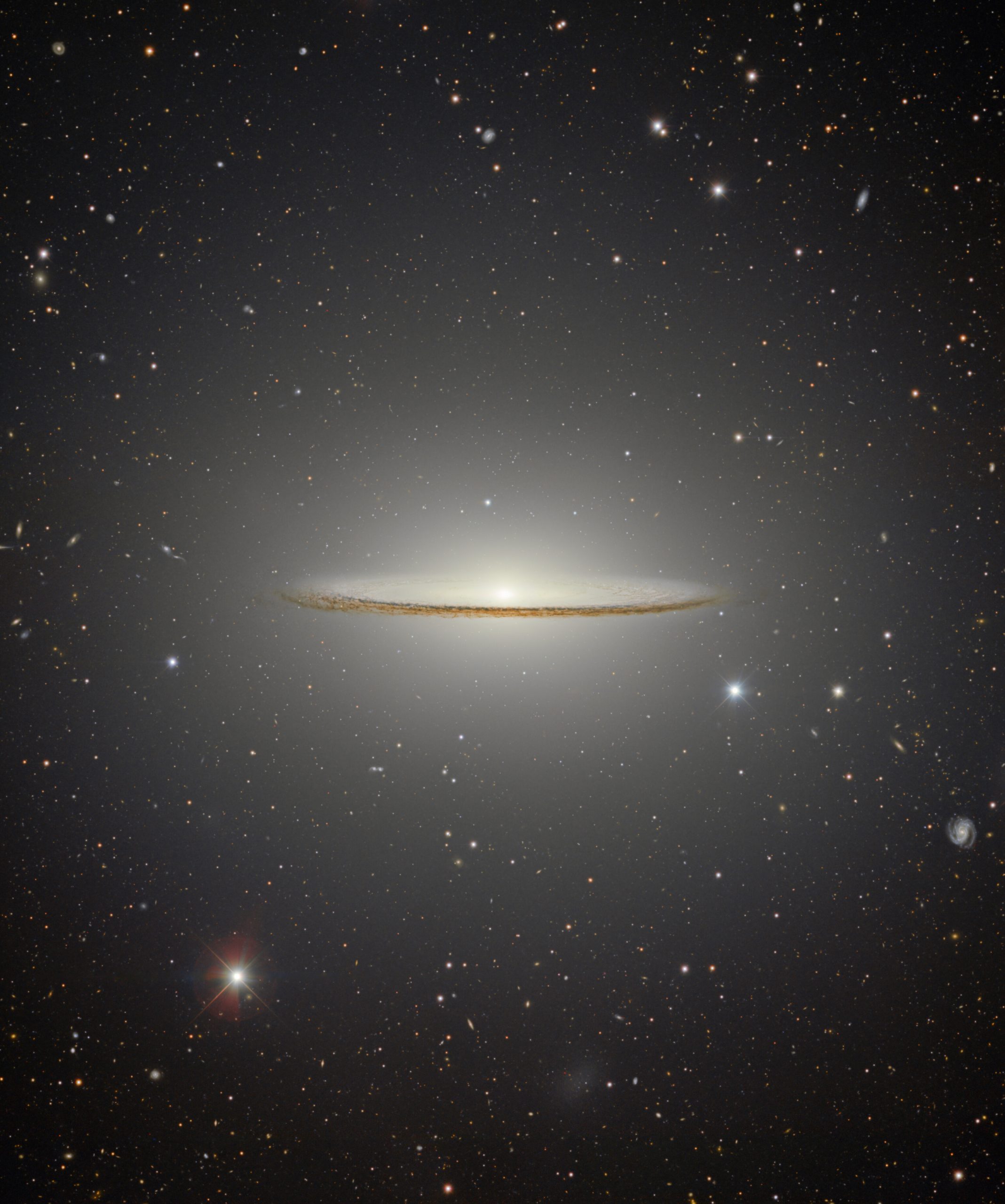 Il caratteristico alone esteso e il disco ricco di polvere di Messier 104, la Galassia Sombrero, sono catturati in questa immagine dalla Dark Energy Camera (Decam), realizzata dal Dipartimento dell’energia degli Stati Uniti e montata sul telescopio Víctor M. Blanco da 4 metri della National Science Foundation (Nsf), presso l’Osservatorio interamericano di Cerro Tololo (Ctio) in Cile, un programma del NoirLab della Nsf. Crediti: Ctio/NoirLab/Doe/Nsf/Aura. Elaborazione immagini: T.A. Rector (University of Alaska Anchorage/Nsf NoirLab), D. de Martin & M. Zamani (Nsf NoirLab)