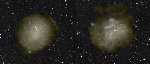 L’immagine mostra due simulazioni di galassia ultra-diffusa ricavate da un’immagine di galassie di fondo del telescopio spaziale Hubble. (Credit: Arianna Di Cintio, Chris Brook, simulazioni Nihao e Hubble Space Telescope).