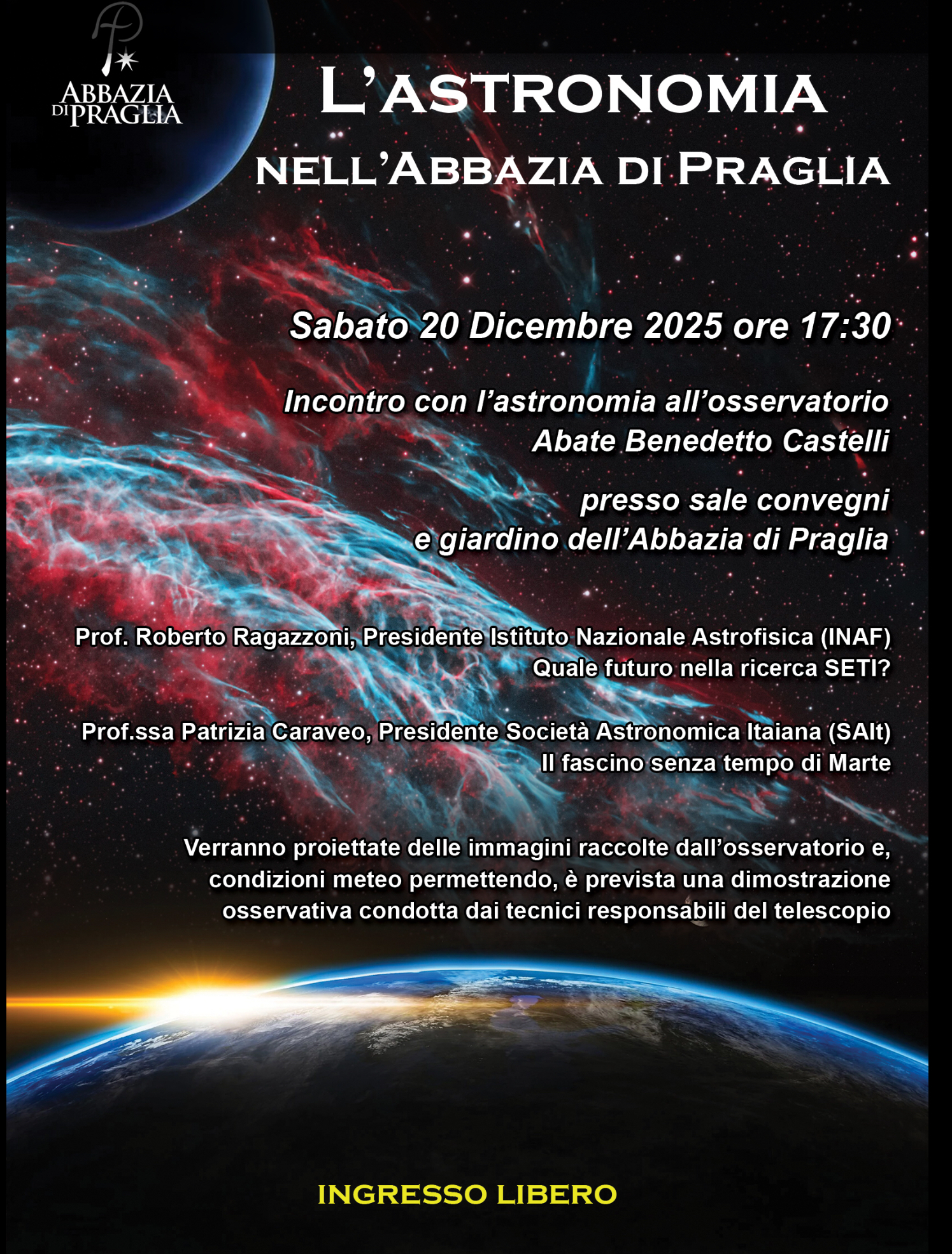 Sabato 20 dicembre, alle 17:30, presso l’Abbazia di Praglia (Teolo, PD), due incontri su “Quale futuro nella ricerca SETI?”, con Roberto Ragazzoni, e “Il fascino senza tempo di Marte”, con Patrizia Caraveo - Concorso "A Gianni Rodari, via Lattea quaraquarinci"